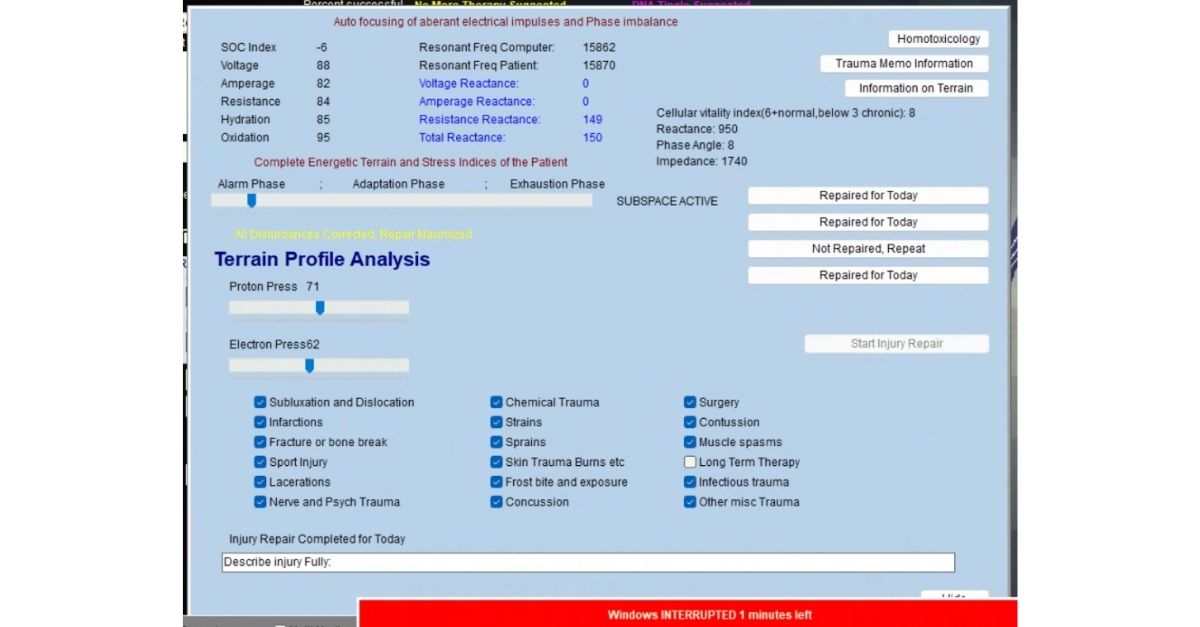 - O que faz: Mede e corrige automaticamente os desequilíbrios nos parâmetros vitais: Voltagem (Adrenais), Amperagem (Cérebro/Intestino), Resistência (Fluxo energético), Hidratação, Oxigenação, Protões e Eletrões. • Como atua: O sistema deteta quais destes valores estão fora da norma (instáveis ou deficientes) e envia frequências de correção até que estes sejam retificados (voltem ao equilíbrio).