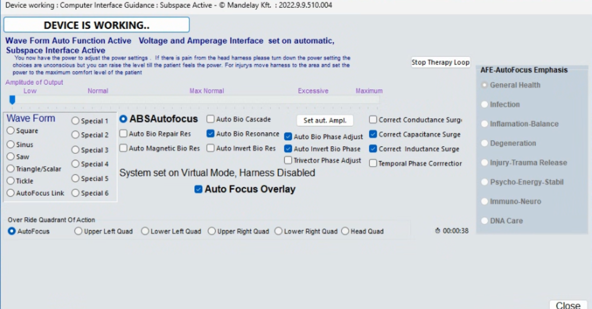 Se olhar com atenção, na caixa onde se lê «SCIO» ou «Mandelay Q9 está a funcionar», existe uma funcionalidade de Auto-Focus. Isto faz com que ajustar as definições de potência do sistema seja uma perda de tempo para mim. E este Auto-Focus é o grande trunfo do nosso equipamento e o que nos coloca entre a elite do Biofeedback. E porquê? Porque me refiro a um mecanismo de ajuste automático de precisão.