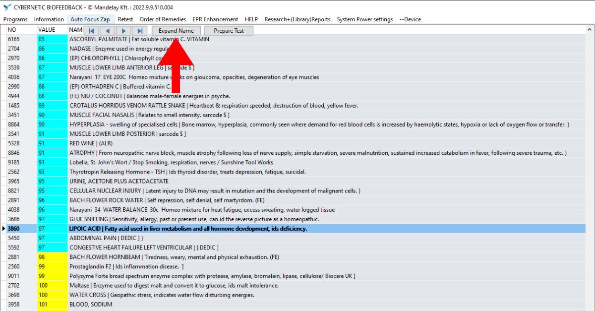 Passos: Destaque um item na matriz -> clique em Expand Name -> selecione o botão de ligação para a coluna (Chiropractic connection) ou homotoxicologia (Tissue connection) .